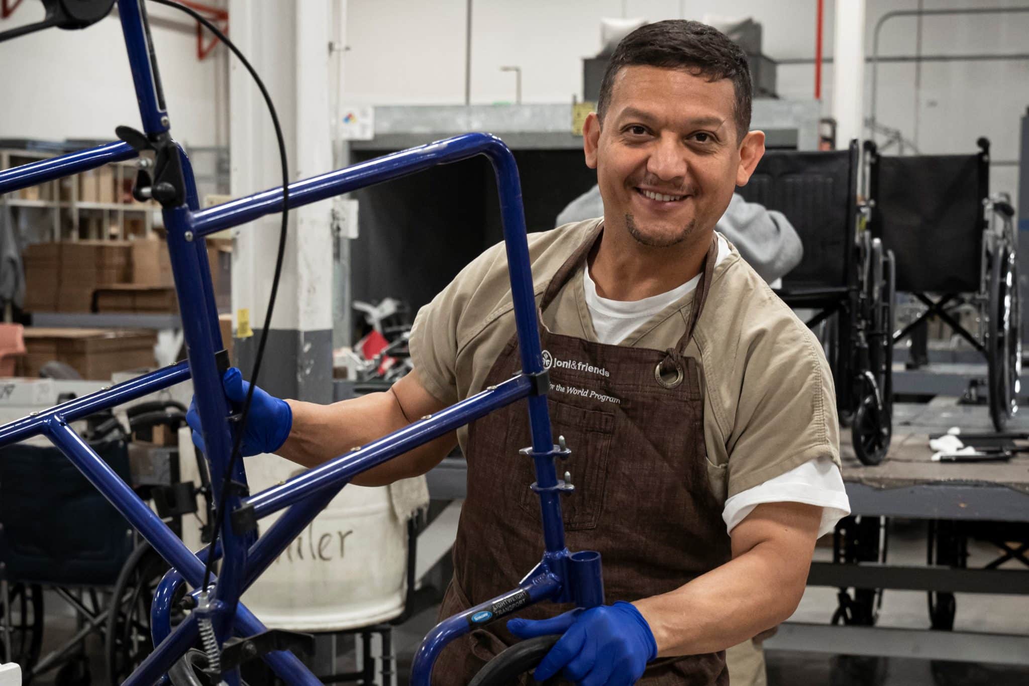 Working in a Wheels for the World restoration center, Javier is responsible for quality control. He makes sure that every wheelchair and piece of mobility equipment is in top condition before leaving the shop. He checks the tires, upholstery, and all moving parts, down to the wheels, which need to be greased and adjusted so they’re not too loose and not too tight.