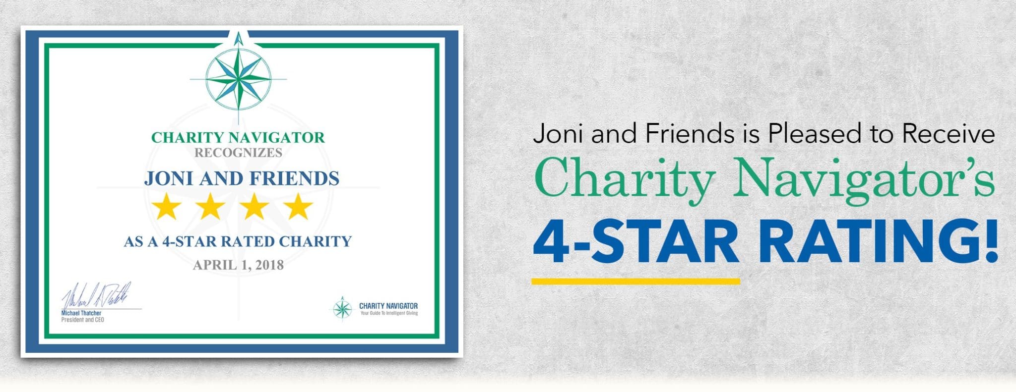 “Joni and Friends’ exceptional 4-star rating sets it apart from its peers and demonstrates its trustworthiness to the public,” Michael Thatcher, President & CEO of Charity Navigator, said. “Only a quarter of charities rated by Charity Navigator receive the distinction of our 4-star rating. This adds Joni and Friends to a preeminent group of charities working to overcome our world’s most pressing challenges. Based on its 4-star rating, people can trust that their donations are going to a financially responsible and ethical charity when they decide to support Joni and Friends.”