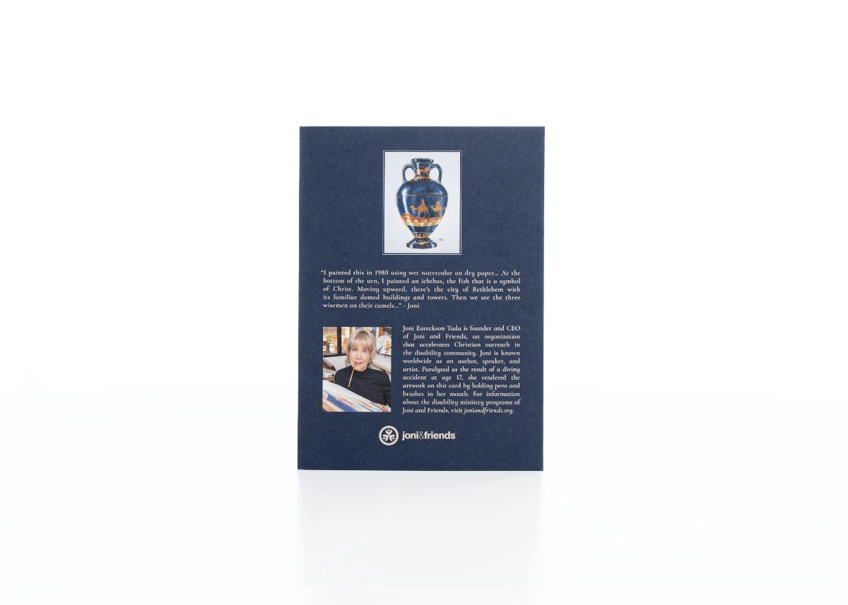 Celebrate the birth of King Jesus with Joni’s stunning new “In Search of the King” Christmas cards featuring her “Bethlehem Urn” artwork. As Joni says, “I painted this in 1980 using wet watercolor on dry paper… At the bottom of the urn, I painted an ichthus, the fish that is a symbol of Christ. Moving upward, there’s the city of Bethlehem with its familiar domed buildings and towers. Then we see the three Wisemen on their camels…”