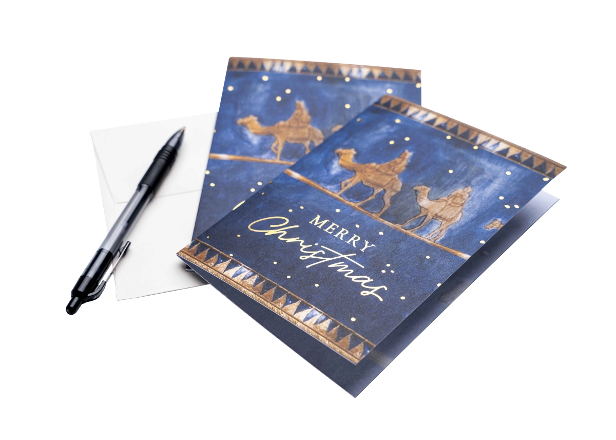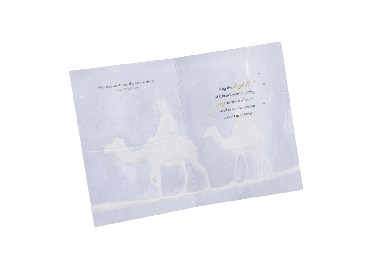 With rich symbology and royal tones of blue and gold, this festive card will encourage your friends and loved ones to seek after Jesus, following the way of the Wisemen.