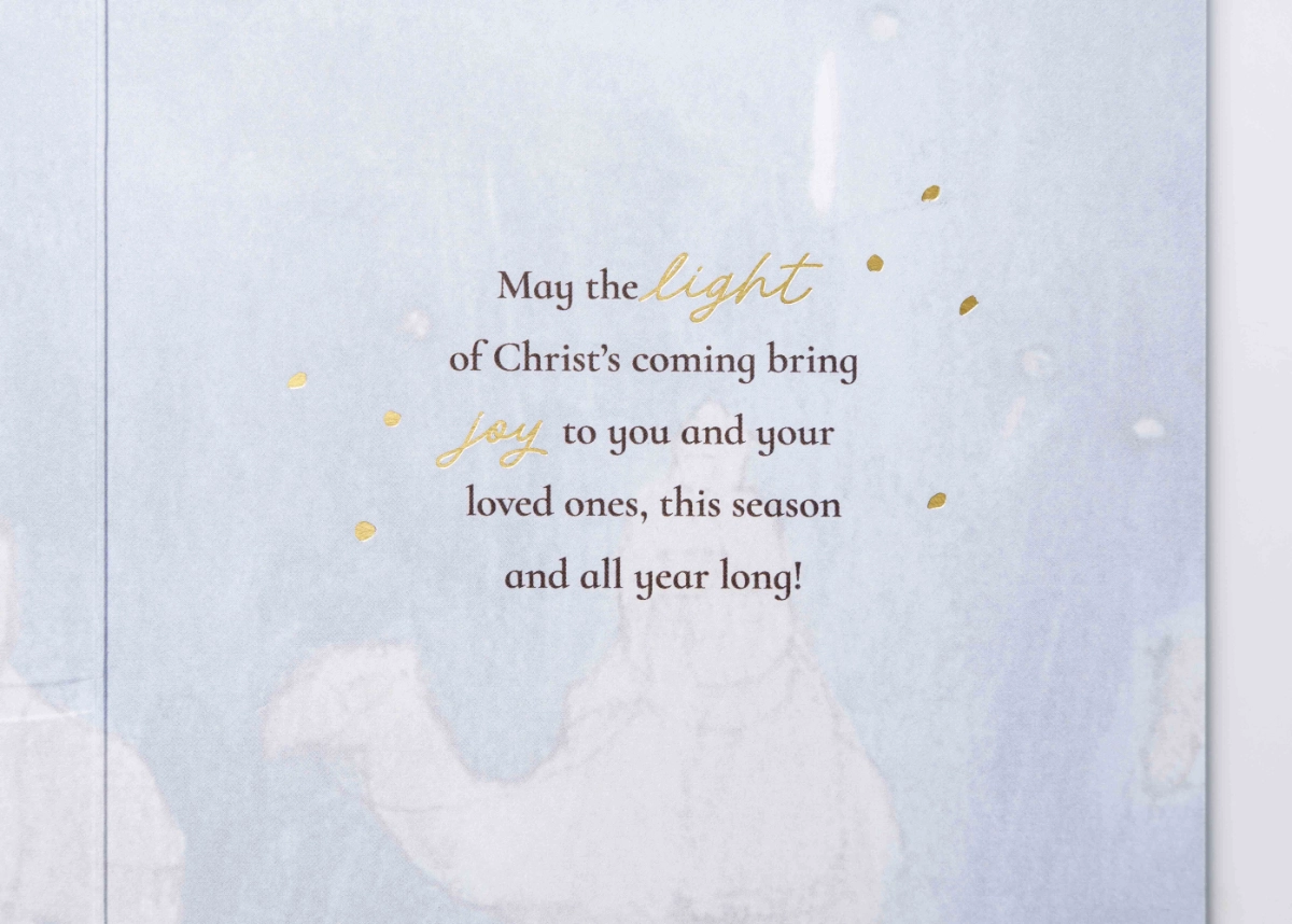 Interior greeting reads: “May the light of Christ’s coming bring joy to you and your loved ones, this season and all year long!”