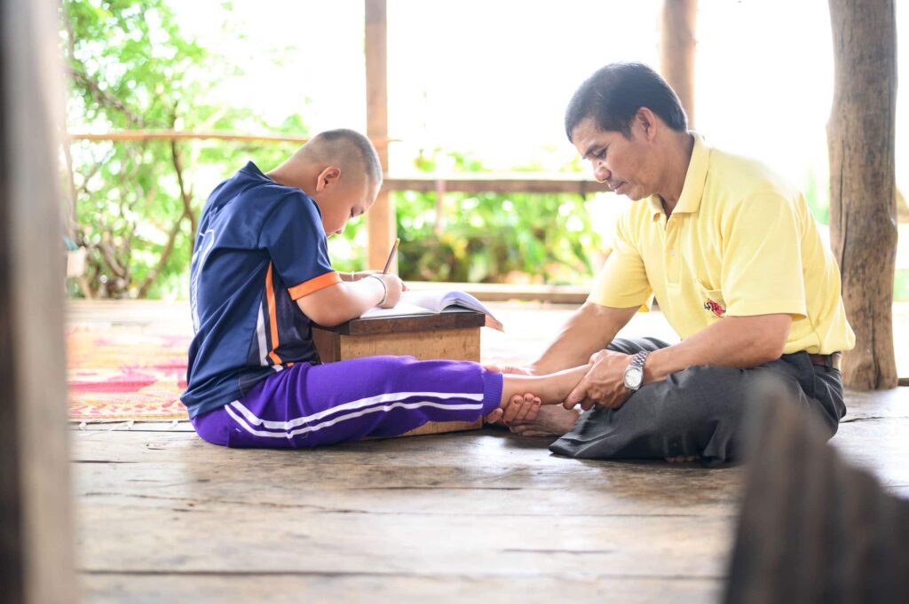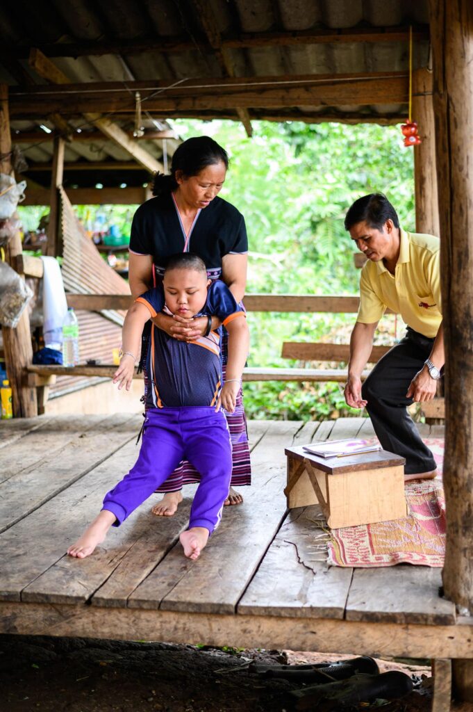 Jackie was born a healthy typical boy. He could walk until he was five years old. “Then he started to fall down again and again. I didn’t really think much about it since I’m the village leader, I am responsible for everyone. I just thought he would be okay,” Ekkachaitold us. Now, Jackie cannot walk or get up on his own. He has no strength and desperately needed a wheelchair.